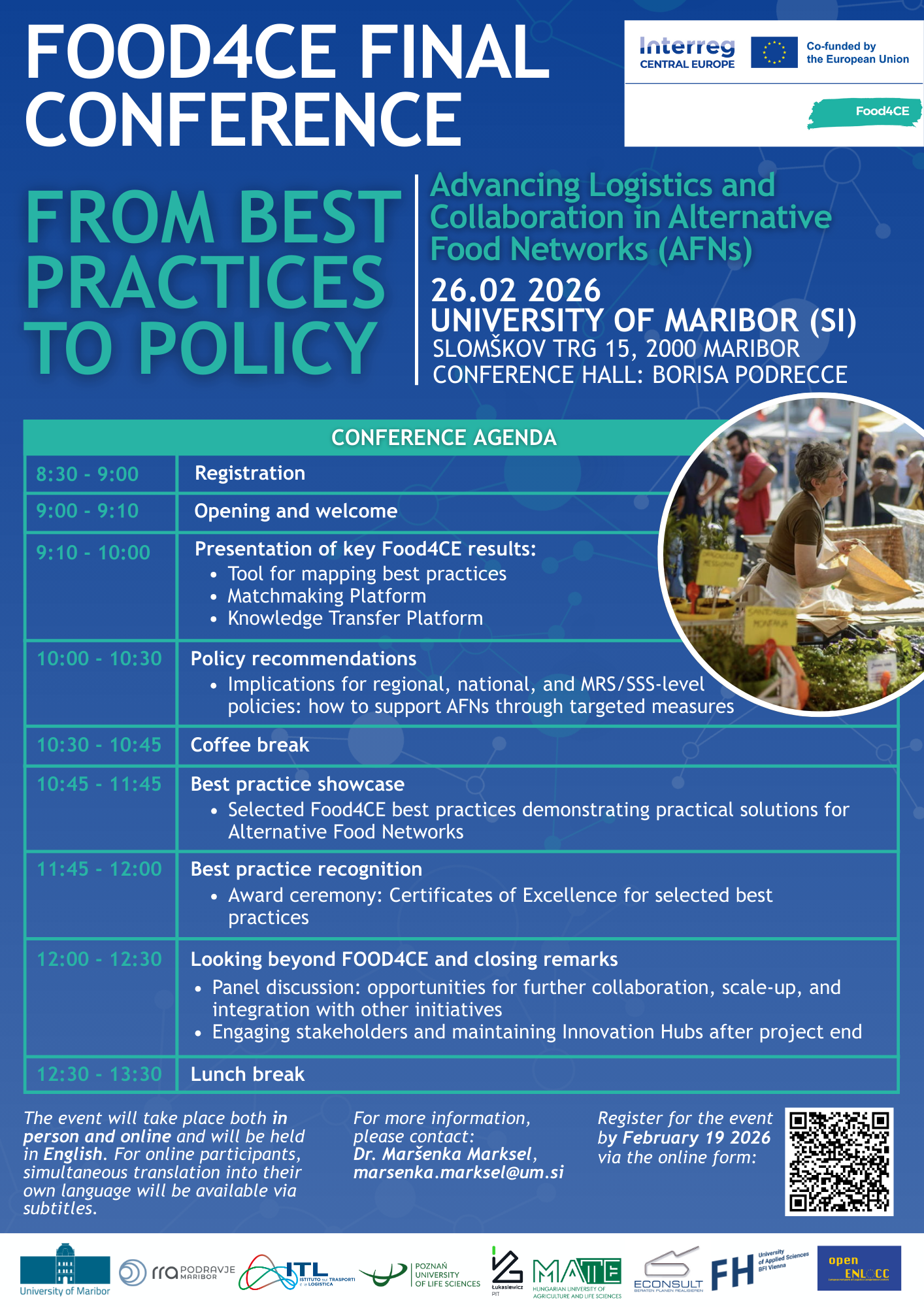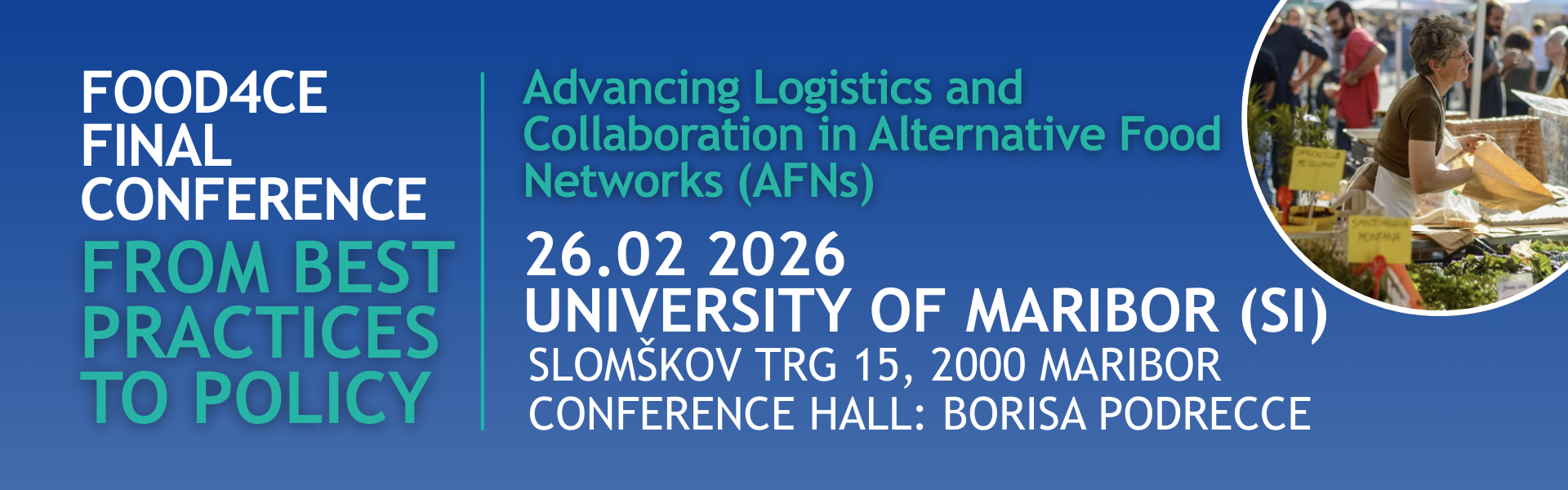 The Food4CE Final Conference, titled “From Best Practices to Policy – Advancing Logistics and Collaboration in Alternative Food Networks”, will take place on 26 February 2026 at the University of Maribor (SI) – SLOMŠKOV TRG 15, 2000 Maribor, Conference Hall: Borisa Podrecca.