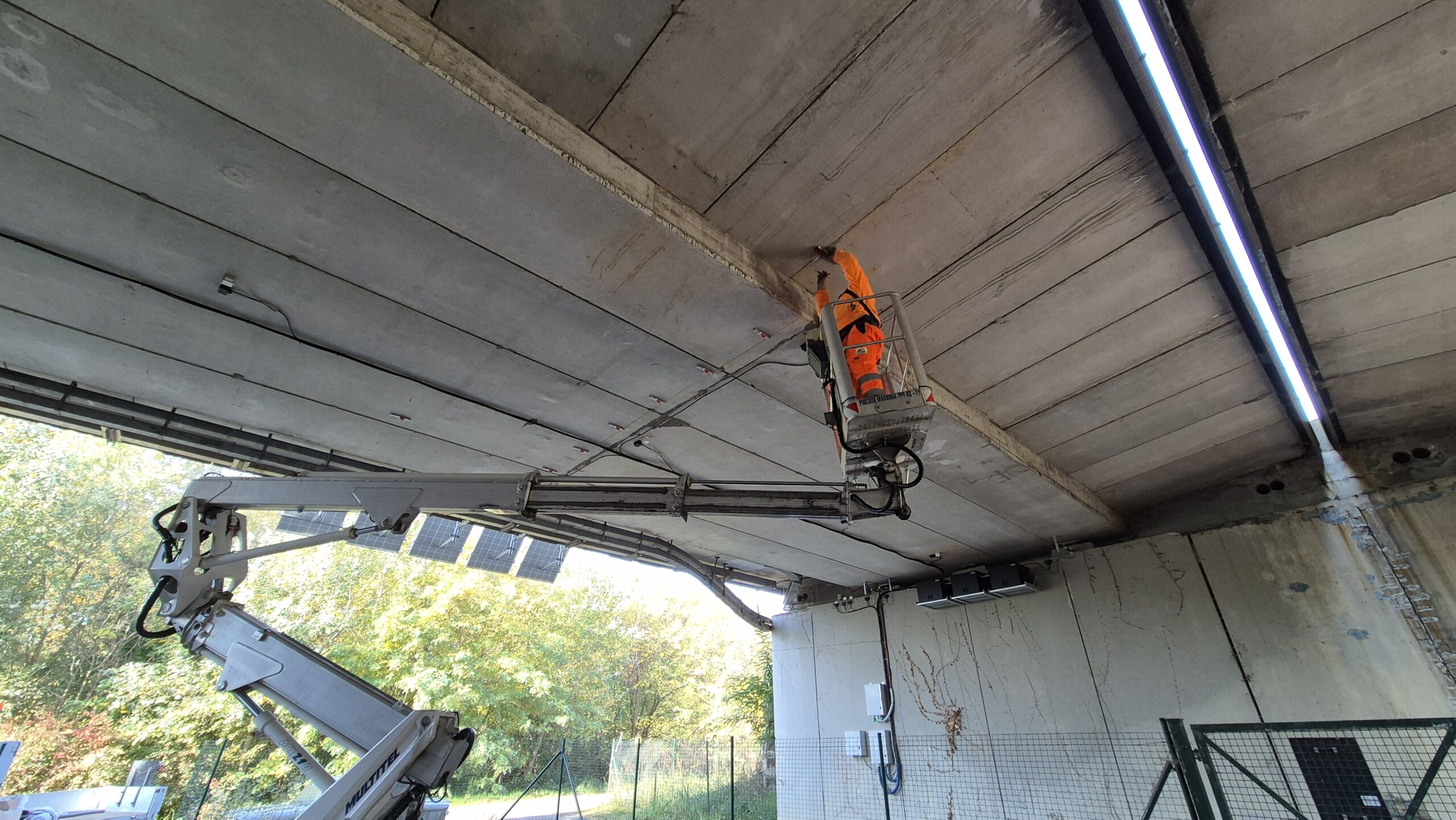 Sensor installation took place from October 21 to 23. During this phase, CESTEL weigh-in-motion (WIM) systems were installed together with a leakage sensor developed by the University of Dresden as part of the BIM4CE project. The WIM systems enable continuous monitoring of vehicle loads crossing the viaduct, while the leakage sensor allows for the detection of water infiltration, which over time could negatively affect the durability and safety of the structure.