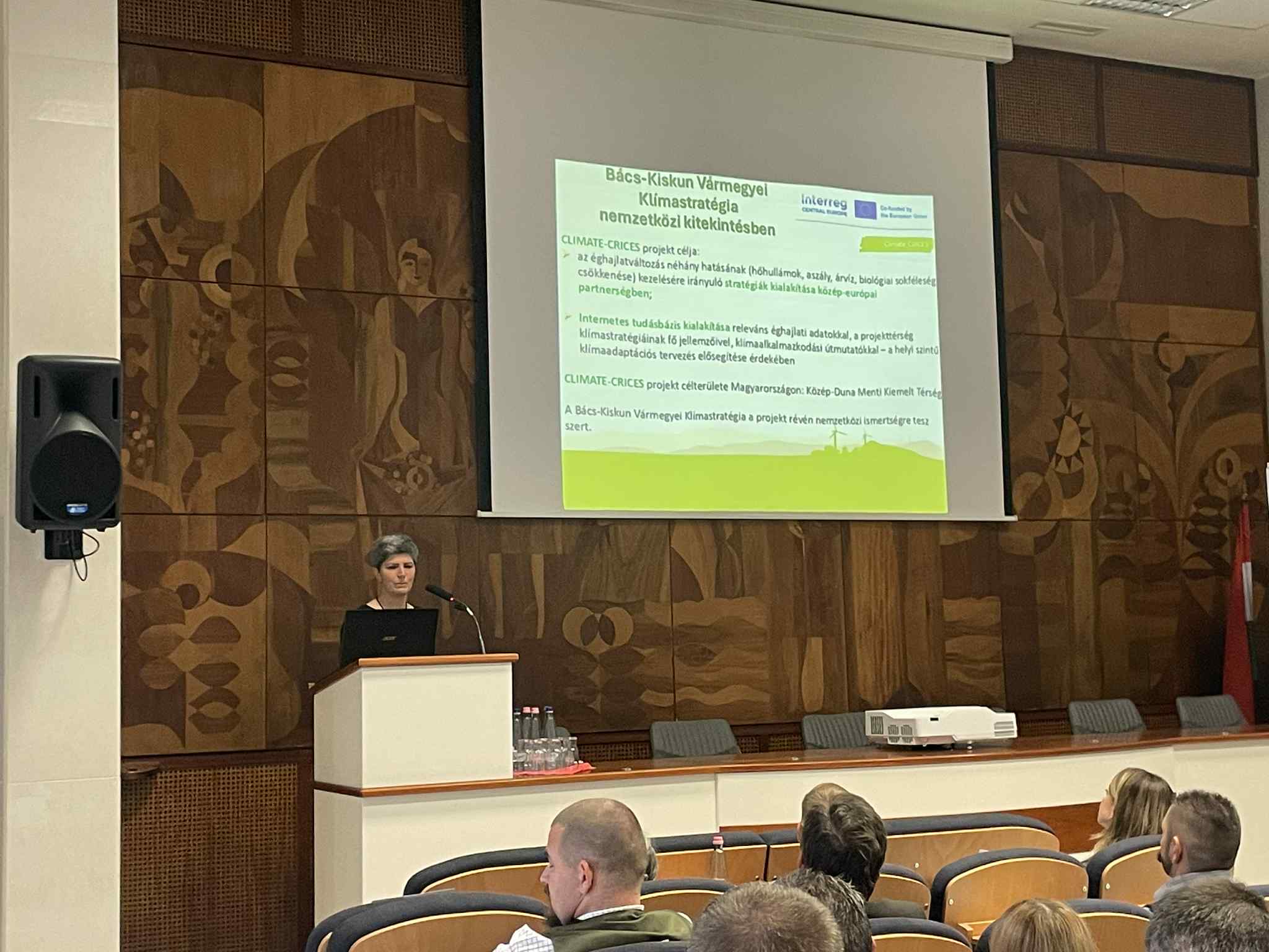 •          Eszter Dobozi a key expert of CDDA introduced the renewed County Climate Strategy and highlighted the Climate_CRICES Interreg project. Her presentation emphasized the project’s Central European partnership, an online knowledge base with climate data and adaptation guidance, Bács-Kiskun’s role in the Central Danube Priority Area, and how the county’s strategy gains international visibility through Climate_CRICES.
