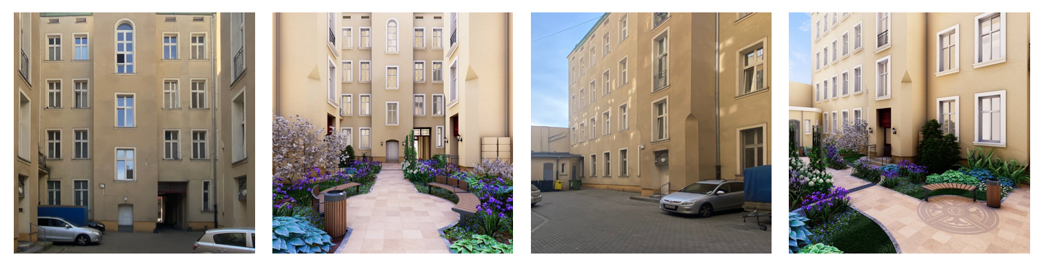 The adaptation plan transforms this historic courtyard from a low-functioning and visually underwhelming space into a vibrant, ecological, and resident-friendly urban oasis, respecting historical heritage while addressing contemporary social and environmental needs. Architekt Miasta